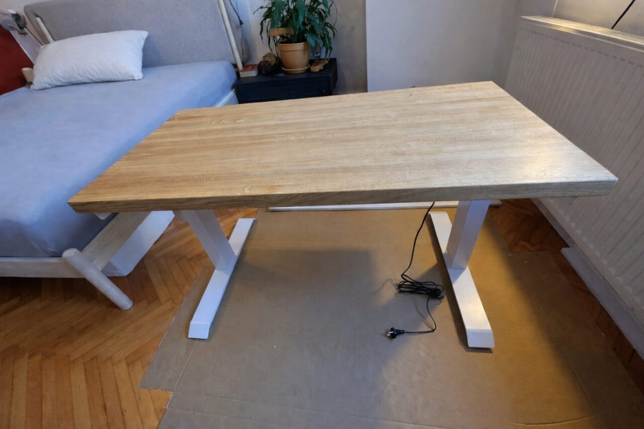 Sestavení stolu zabralo cca půl dne (zhruba 6-8 hodin) od vybalení přes sestavení nohou, vyřešení držáku kabelů, vycentrování nohou na desku s přesností na několik desetin milimetru (nechci mít stůl křivě), finálnímu připevnění všeho k desce pomocí akušroubováku až po ustavení, vyvážení stolu a vyzkoušení. Nakonec vše fungovalo na první pokus. Dokonce si stůl pamatuje nastavení všeho i při odpojení od elektřiny - pračky a myčky by se mohly inspirovat! :-)