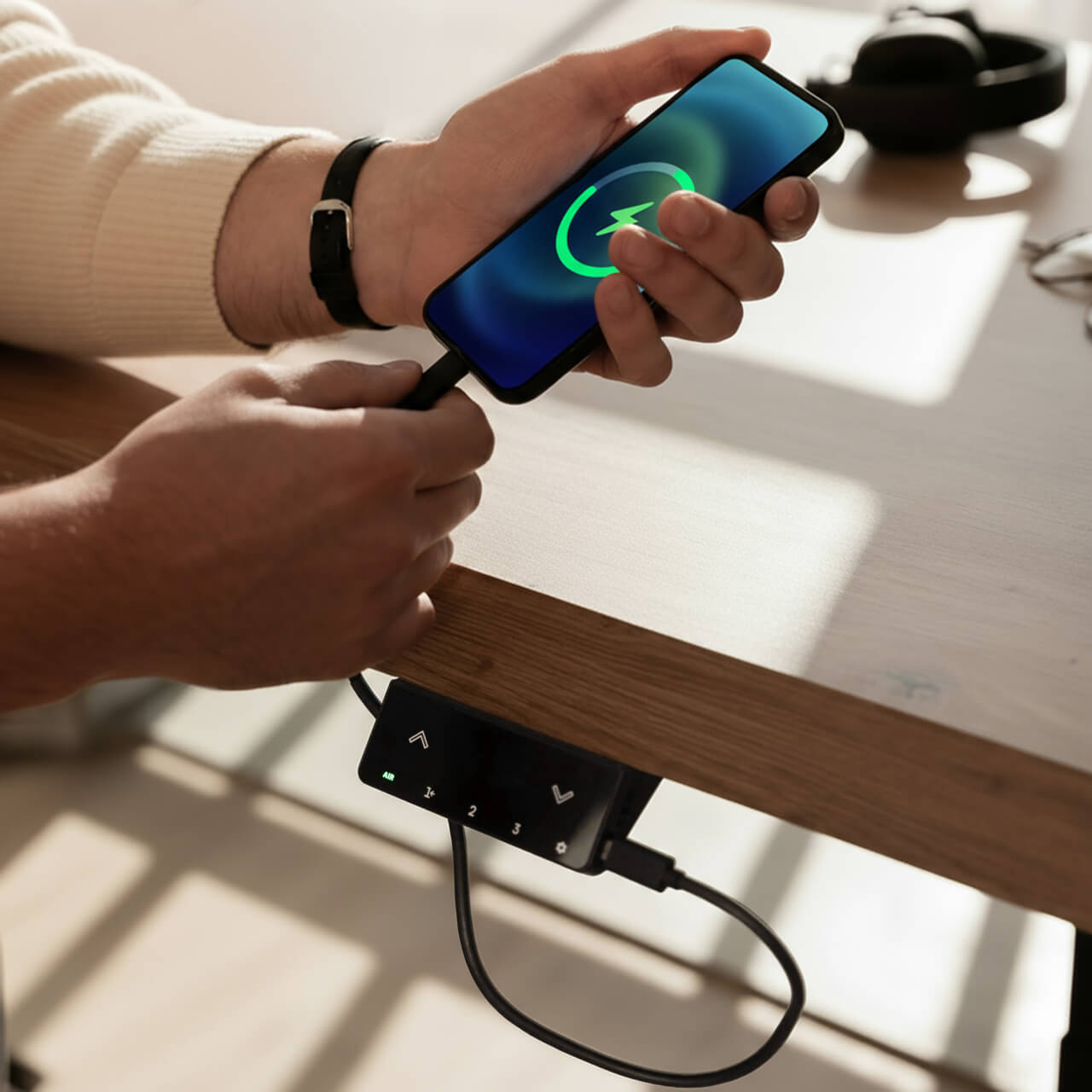 ✓ USB-A a USB-C výstup nabije telefon nebo jiná zařízení přímo u stolu.